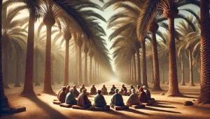 DALL·E 2024-11-06 16.43.10 – A beautiful date palm grove in 8th-century Medina, with a tranquil and peaceful atmosphere. People are sitting in a circle, engaged in conversation, b